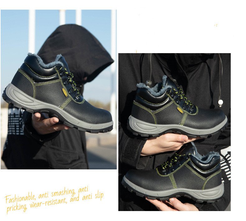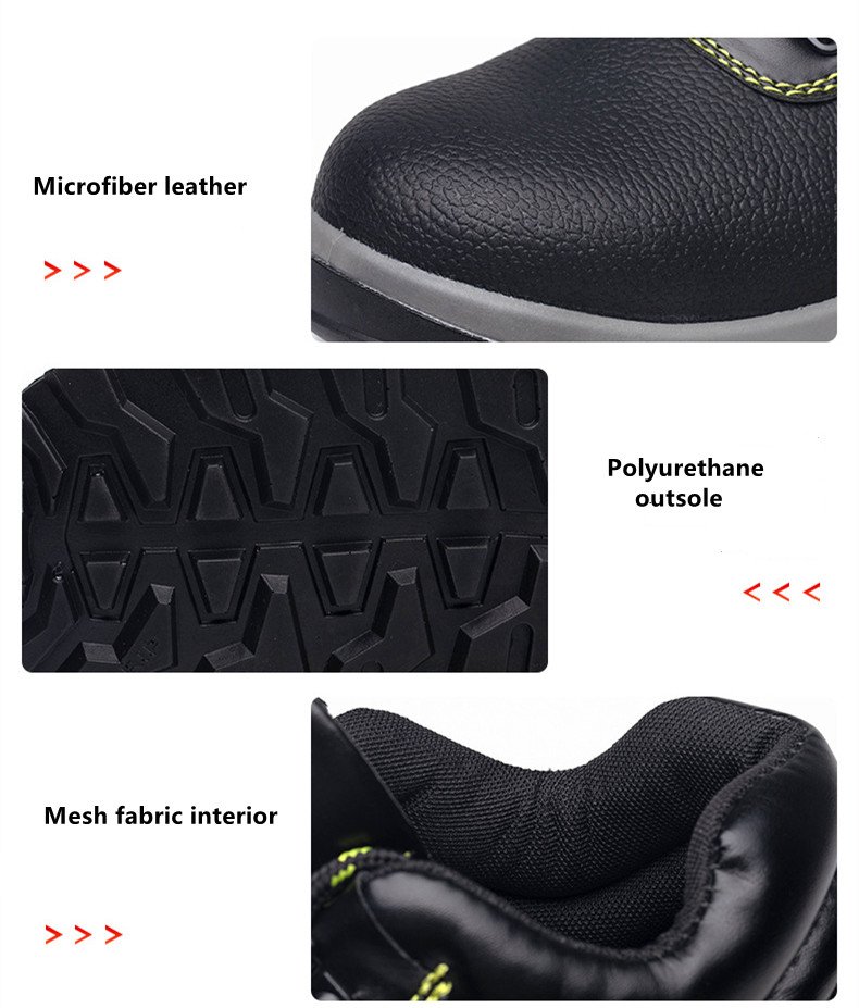 The upper is made of microfiber leather, and it features a steel toe, Kevlar midsole, anti-shatter and anti-puncture properties, as well as a polyurethane solid anti-slip sole.